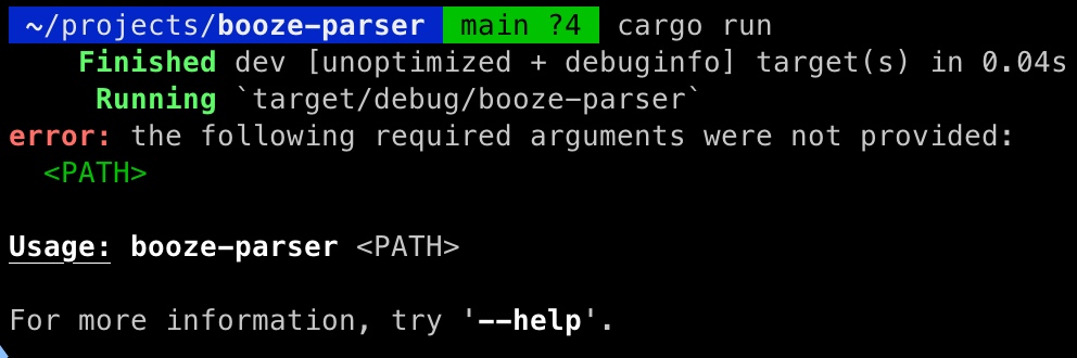 If we do not provide a path, our application throws a nice error due to using the clap crate: