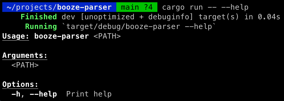 Alright, off we go! First things first, let's use cargo to create a new project by running cargo new booze-parser. Then we can cd into our newly created project directory and test our executable by running cargo run. This yields a "Hello, world!" output on our terminal. Next, let's get it to take in some command line arguments.