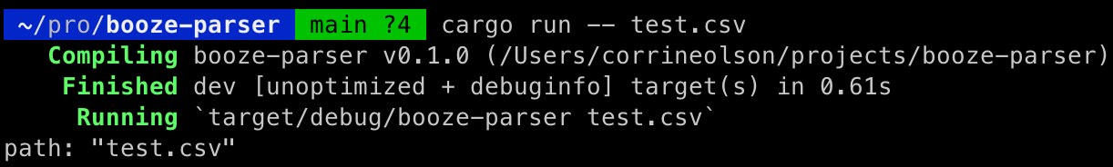 I really like how easy this was. Honestly, clap was probably overkill for our simple parser, but I could see it being super useful to a complex CLI application. Alright, great! We can take a file in. Next up: parsing a file!