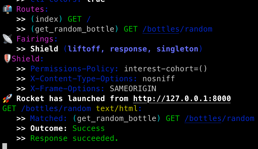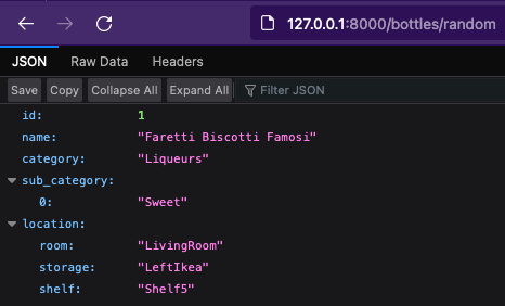 We accomplished our goal of getting an initial "random bottle" working. It took a bit and we had some fun playing around with data structures in Rust, but mission accomplished. Next time, I plan on implementing the other basic routes I will need (still with dummy data for the time being): create, list, and delete. I will also implement a search route... but we may leave that for Part V!!! For now, I think I deserve a break...