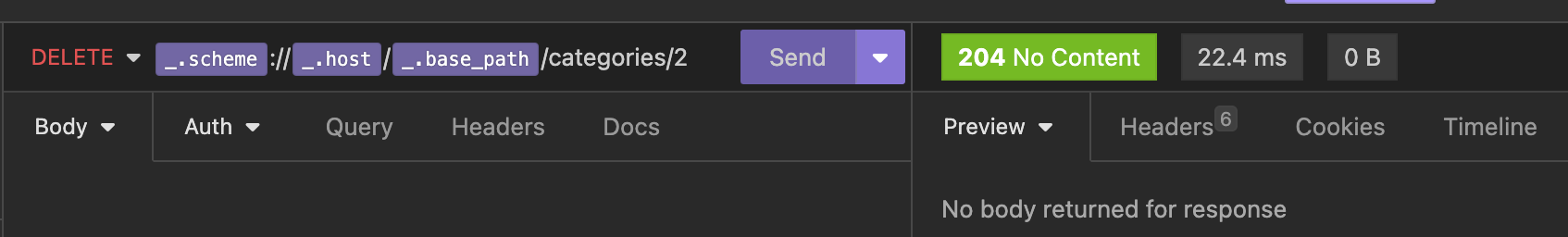 Phew! Crisis averted. Another way we could have fixed our mistake is by deleting the category and creating a new one! In fact, you may have noticed my records started with 2 as the id instead of 1. This is due to some testing I was doing before I took my screenshots (whoops). So lets take a look at what the delete endpoint looks like: